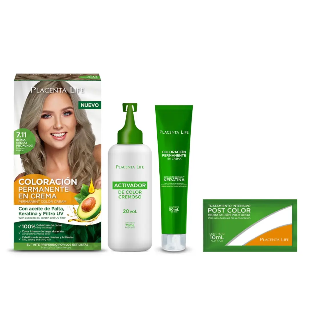 Kit Placenta Life Coloración Permanente en crema – 7.11 Rubio Ceniza Profundo